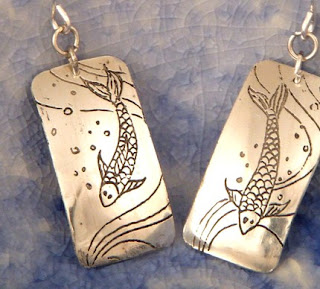 I like fish, it's a bit of an obsession. They are everywhere in my house, (tastefully of course). These earrings are made from sterling silver and I used Nitric acid to etch in my design. Simple, nothing too glamorous, but I like them anyways!