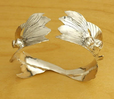 More silver, more etching. The bracelet was originally a flat, plain piece of metal. I cut out the form in 2 pieces (to save silver) and soldered the two together to have a semi-symmetrical piece. I fabricated the shape using a sinusoidal stake, (picture to the right), creating a compound curve.