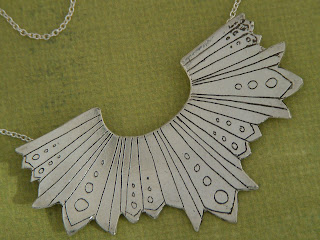 This necklace I created by sawing out a piece of 20 gauge silver. I covered it with a resist to protect the silver from the nitric acid and only etch whatever I drew out of the design.