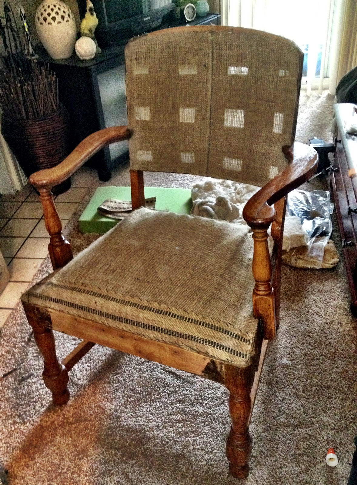 The base of the chair is complete, new springs, burlap and arms are secured back on |